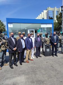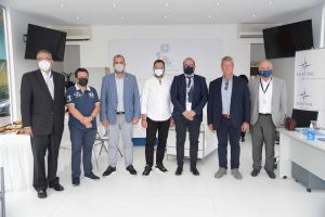 Από αριστερά ο Πρόεδρος ΝΕΕ Δρ. Γ. Δ. Πατέρας, ο ΓΓ Λιμένων, Λιμενικής Πολιτικής και Ναυτιλιακών Επενδύσεων Δρ. Ευάγγελος Κυριαζόπουλος, ο Υφυπουργός κ. K. Κατσαφάδος, ο αρχηγός ΛΣ κ. Θ. Κλιάρης, ο Υπουργός Ναυτιλίας κ. Γ. Πλακιωτάκης, ο ΓΓ Αιγαίου και Νησιωτικής Πολιτικής κ. Ε. Κουτουλάκης
